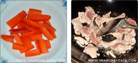 3.ニンジンは皮をむき、薄い短冊切りにします。 4.中華鍋に入れたサラダ油を熱し、豚肉を入れて炒めます。