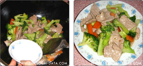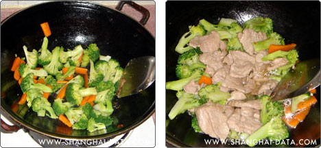 5.色が変わったら、取り出します。 6.同じ鍋で、人参、ブロッコリーを入れて強火で炒めます。 7. 調味料を加えて、豚肉を鍋に戻します。
