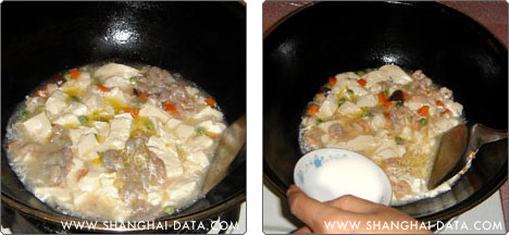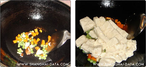 3.中華鍋にサラダ油を熱し、人参、シイタケ、グリーンピースを入れて炒めます。 4.人参が柔らかくなったら、豆腐、調味料を入れます。