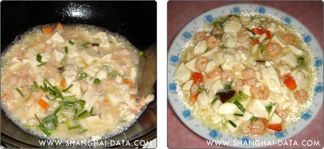 5.次にむきエビを入れます、4,5分煮込みます。 6.水溶き片栗粉でトロミをつけます。